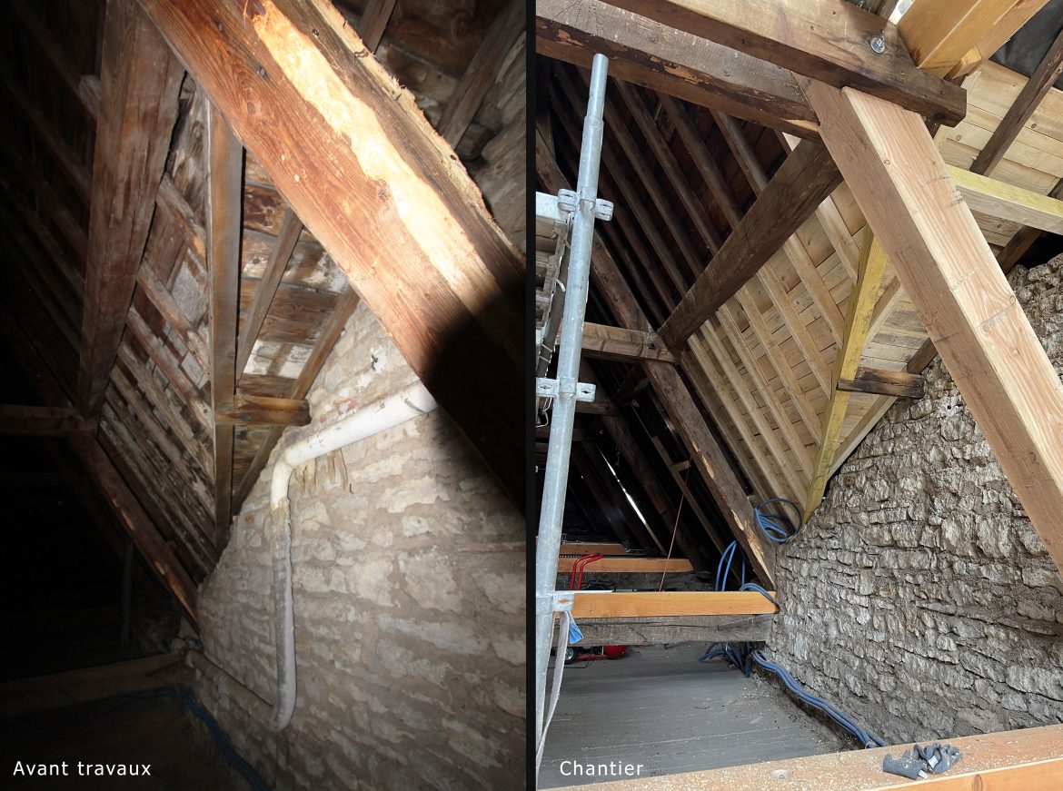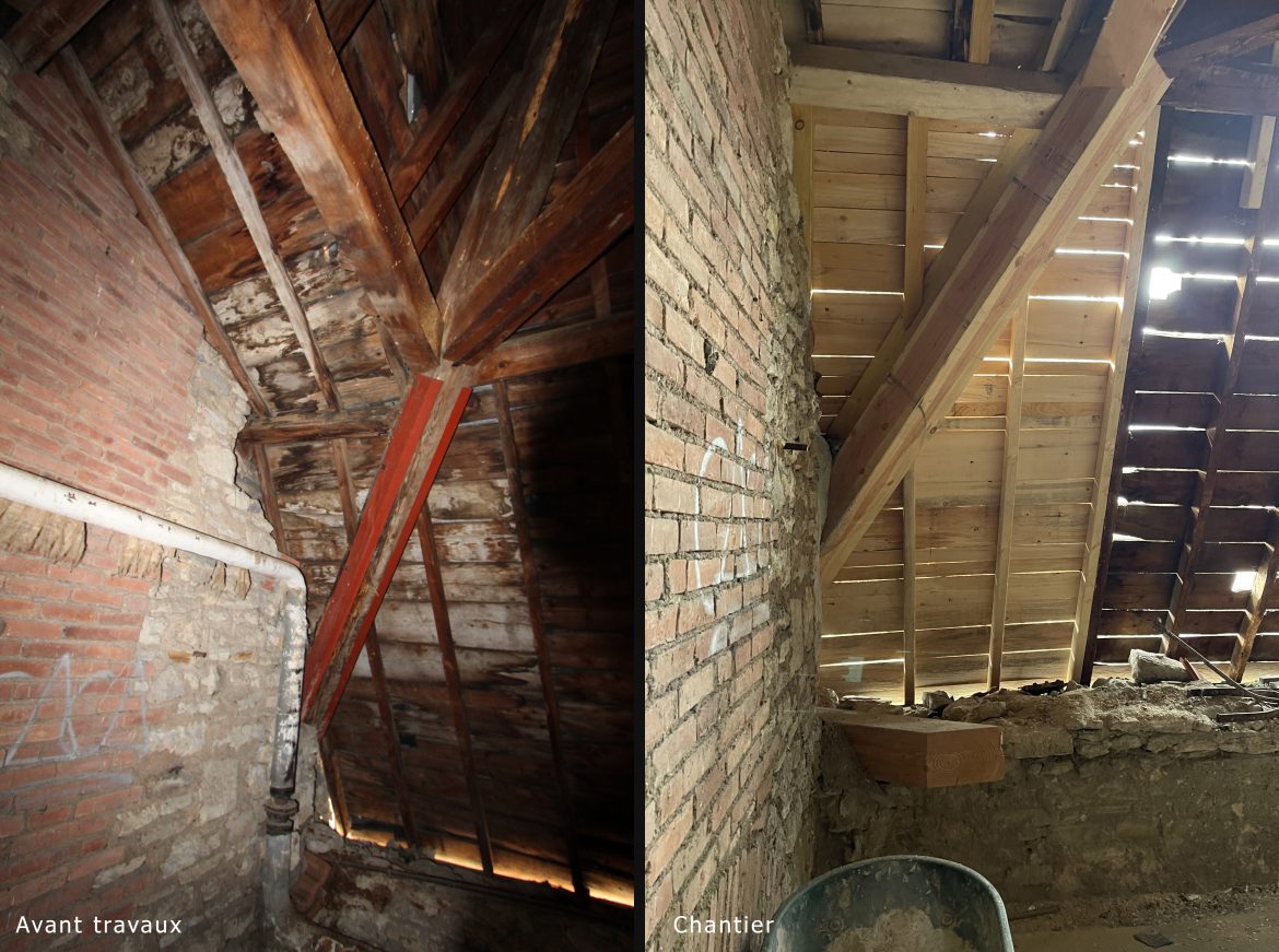 L’objectif de la Mairie de Billom est d’ouvrir partiellement le rez-de-chaussée et le premier étage du collège des Jésuites au public, à travers un programme de locaux mis à disposition pour diverses associations. Le parti pris architectural reprend l’écriture des dispositions en place par les Militaires au 19e siècle, particulièrement encore très présent sur le site, à l’exception de la reprise des enduits dans la cour intérieure qui reprend les teintes conservées par les Militaires au 17e siècle. Plus précisément, les travaux de charpente comportent deux types d’intervention. La première, de restitution de la charpente de l’aile Sud totalement détruite par l’incendie de 1998. La seconde, pour des interventions ponctuelles de consolidation et de préservation des bois existants sur les autres ailes Nord, Est et Ouest. Les travaux de couverture s’inscrivent dans la continuité de la première phase des mesures d’urgence réalisées en 2018, à savoir la réfection de l’ensemble des couvertures du site.